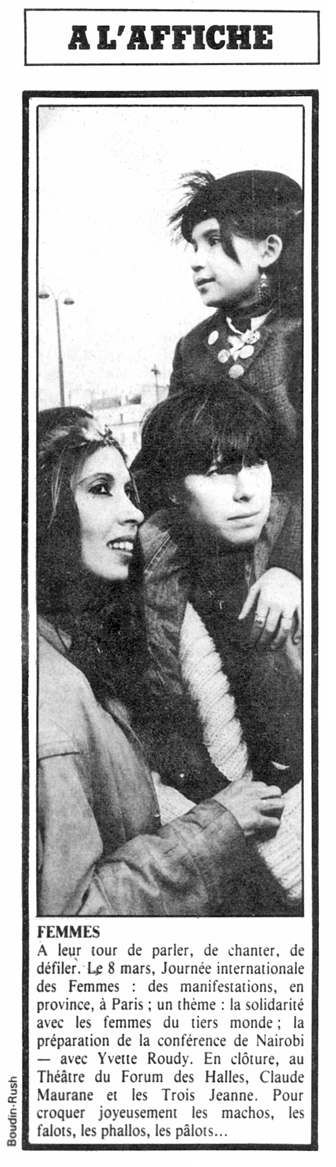 C’était lors de la première “Journée internationale des droits des femmes” en France, à l’initiative d’Yvette Roudy. J’étais avec Tatiana ; j’étais trop petite pour marcher longtemps, alors son amie qui nous accompagnait m’a prise sur ses épaules — nous formions un très joli trio. C’est sans doute pour cela qu’un photographe nous a immortalisées ainsi !