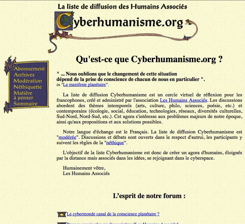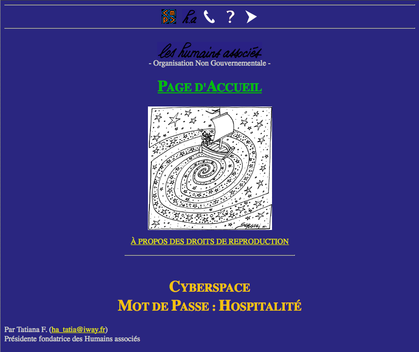 Un jour de 1994, Philippe Quéau, alors directeur de recherche de l’INA et membre des Humains Associés, nous propose de créer un site Web pour l’association sur le serveur de l’INA qu’il vient de créer. Internet est totalement — mais totalement — inconnu ! Mais nous étions déjà connectés !